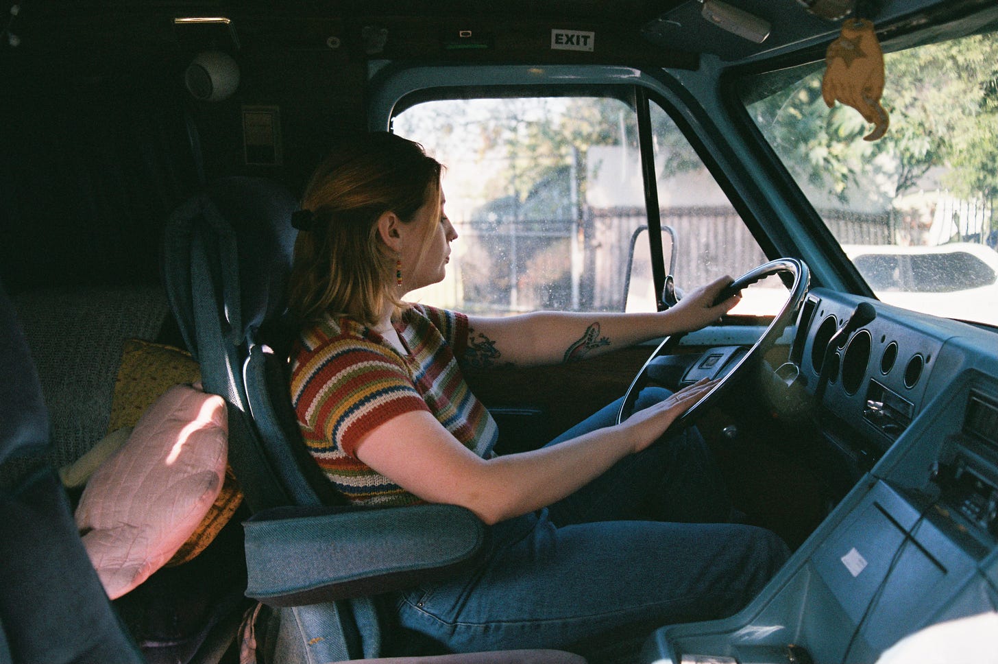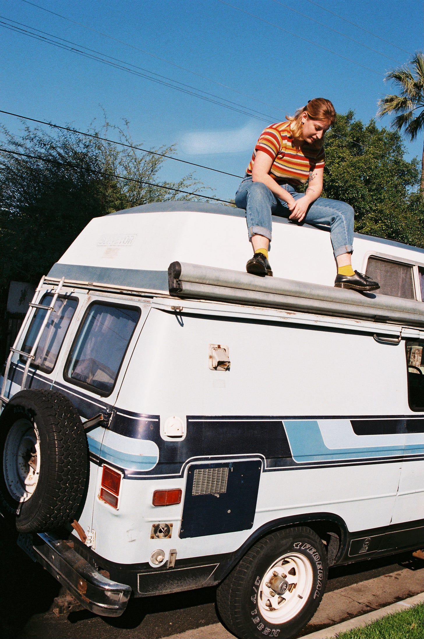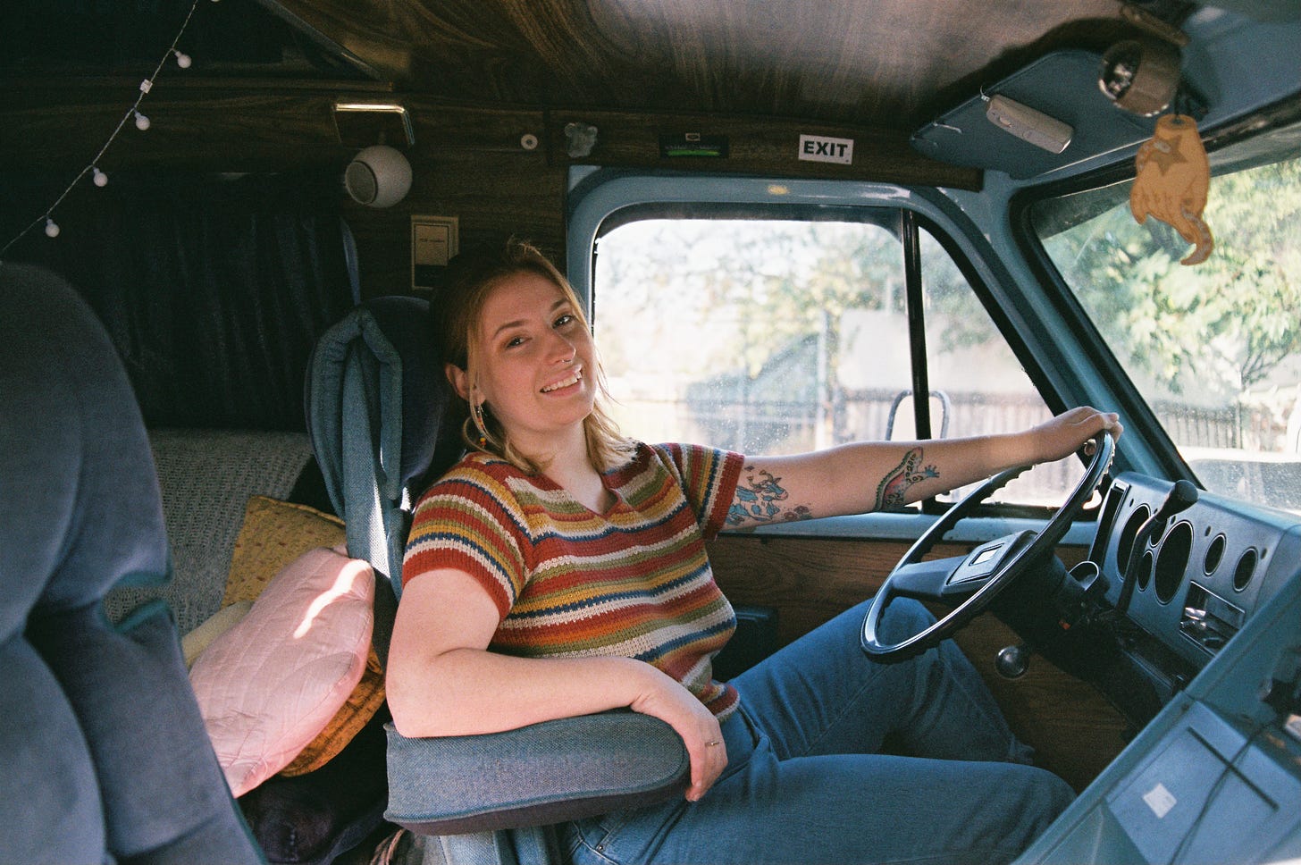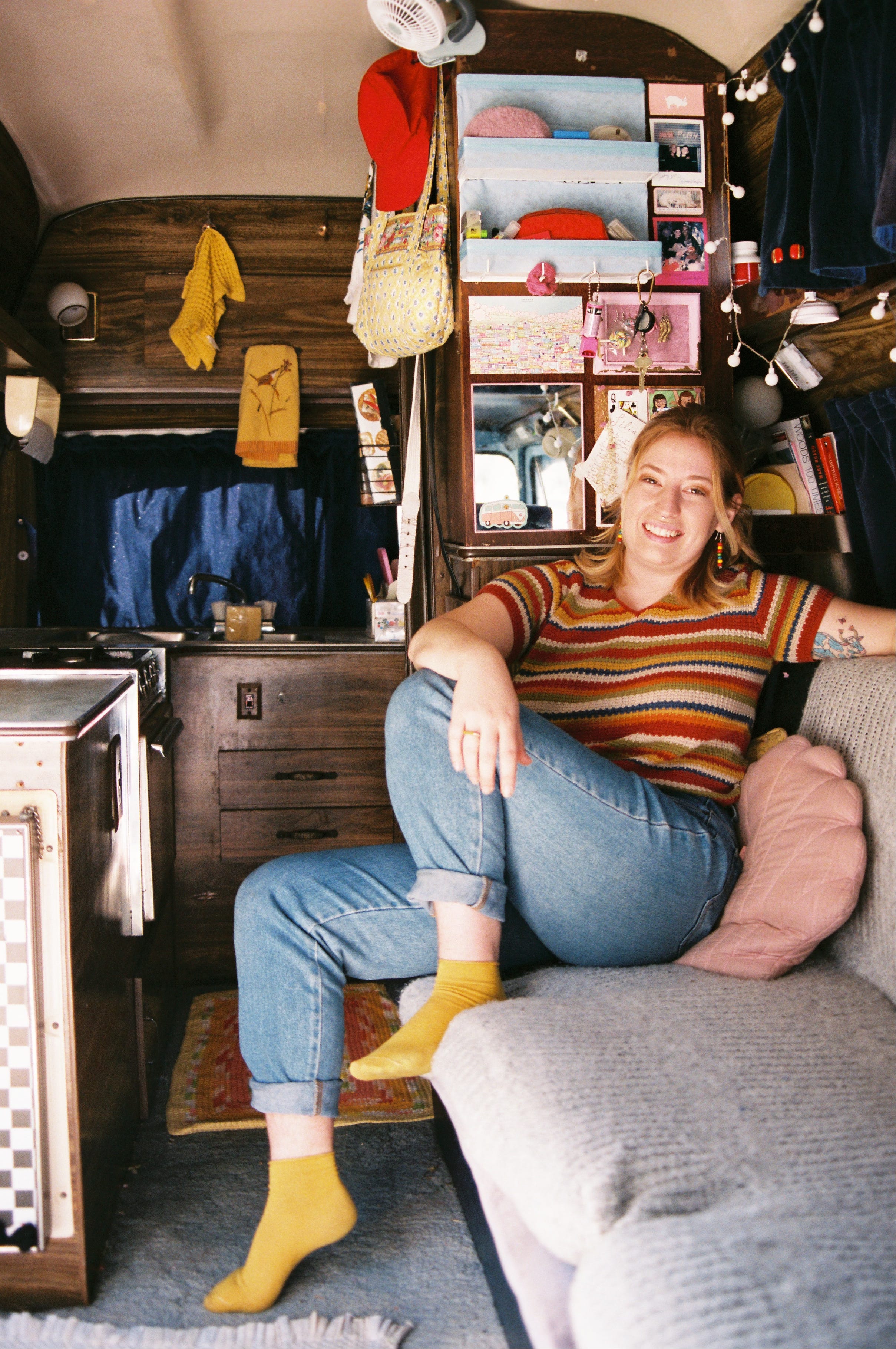 I did it partially because I was going to graduate and I wasn’t really sure what my money situation was going to be like. I ended up getting the van two months before graduation and I also started watching a lot of videos about it. It seemed a lot more sustainable because I don’t think we actually need that much space to live… so space-saving solutions are very interesting. I wanted to build out my own van but it just wasn’t quite as practical at that time but I feel like that could still happen down the road. In terms of pros and cons, I discovered that in winter it could get really cold at night. I would be fine in my bed with all my bedding, but my face would get cold and it would make it impossible to get out of bed. It’s like getting out of bed and basically stepping outside. With winter it would get dark really early and my space is so affected by natural light because I didn’t have the best lighting system. The biggest downside of not having electricity is the fridge. That has been a challenge… finding good ways to cook. I have a fridge in my office, so I would just wake up and go to work and I’ll eat breakfast, lunch, and dinner there. It’s definitely a challenge feeling spread out between my studio, my van, and work. I feel like I have three homes. At Least one of them can travel.